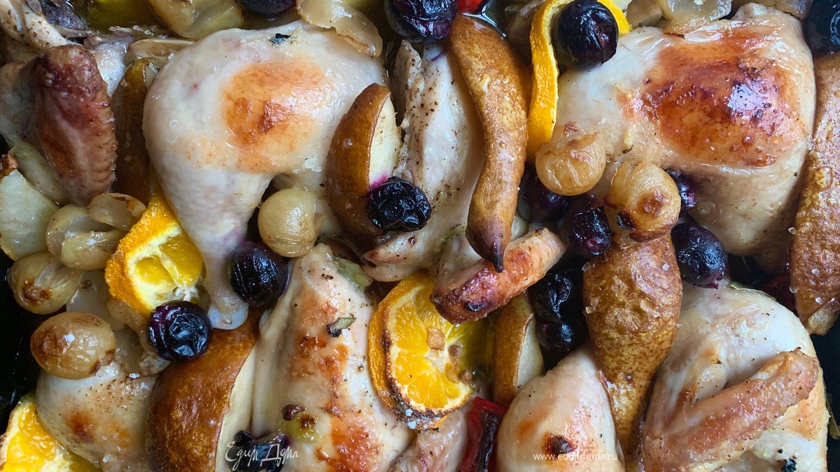 Мандарины — кружечками, переложить ими кусочки цыплят. Виноград слегка примять рукой и отправить туда же. Залить белым вином. Духовка — на 180°C, выпекаю 35–45 минут. - Шаг 5
