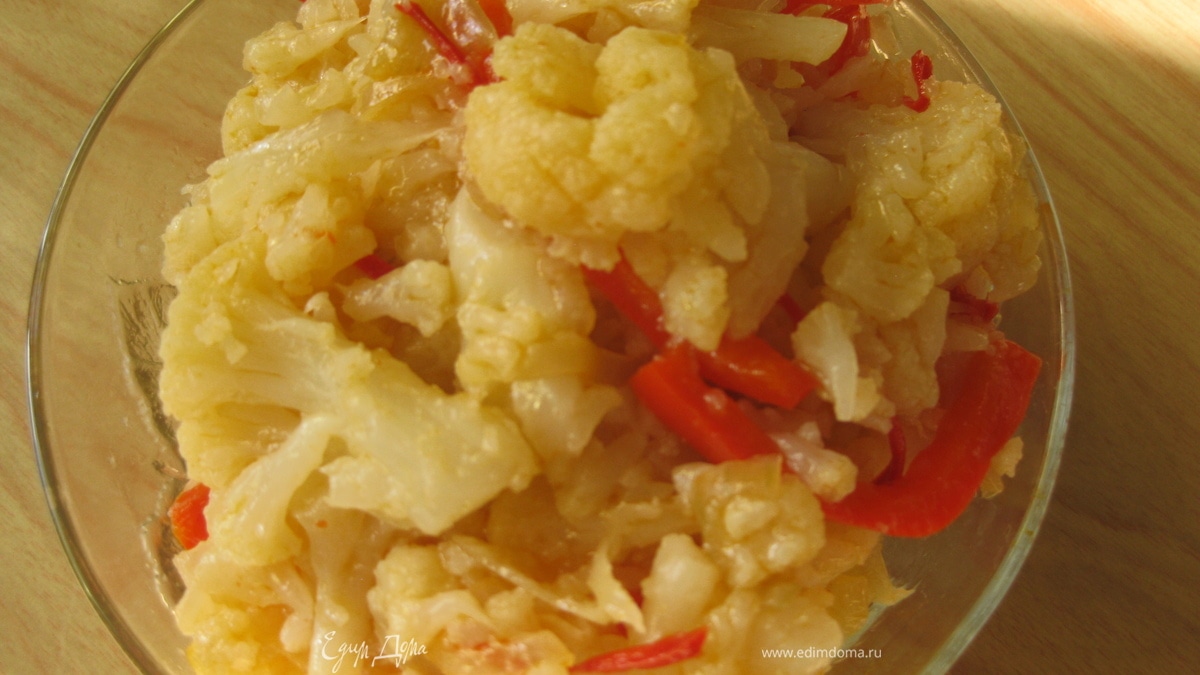 - Шаг 11. Капусту разбираем на соцветия и отвариваем в подсоленной воде с лавровым листом и душистым горошком до готовности или до состояния альденто. Сливаем воду. 2. Разогреваем глубокую сковороду, вливаем оливковое масло и пассируем резанный полукольцами лук с тонкими полосочками нарезанного перца чили. 3. Туда же добавляем нарезанный на полосочки перец- паприка и цветную капусту, и готовим на сильном огне при постоянном помешивании до чуть сыроватого состояния перца -паприки. Через пресс выдавливаем чеснок и хорошо перемешиваем. Все готово. ПРИЯТНОГО АППЕТИТА!!!
