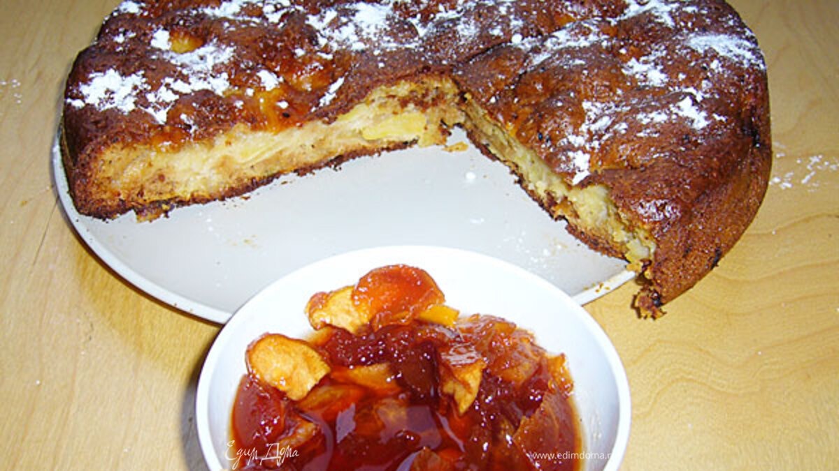 - Шаг 6Остудить, посыпать пай сахарной пудрой и корицей. Подавать с вареньем. Можно есть и горячим, но тогда пудрой не посыпать -растает.