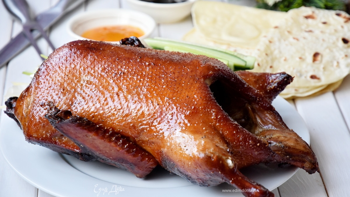 Это мой вариант знаменитого рецепта утки по-пекински. Вариацией я назвала его, потому что использовала обычную утку из супермаркета. В отличие от «набитой», она не откармливалась ровно 65 дней, не весит 3 кг и не такая жирная, как полагается. В свою очередь старалась соблюсти большинство правил приготовления и настроилась на длительный процесс в двое суток.