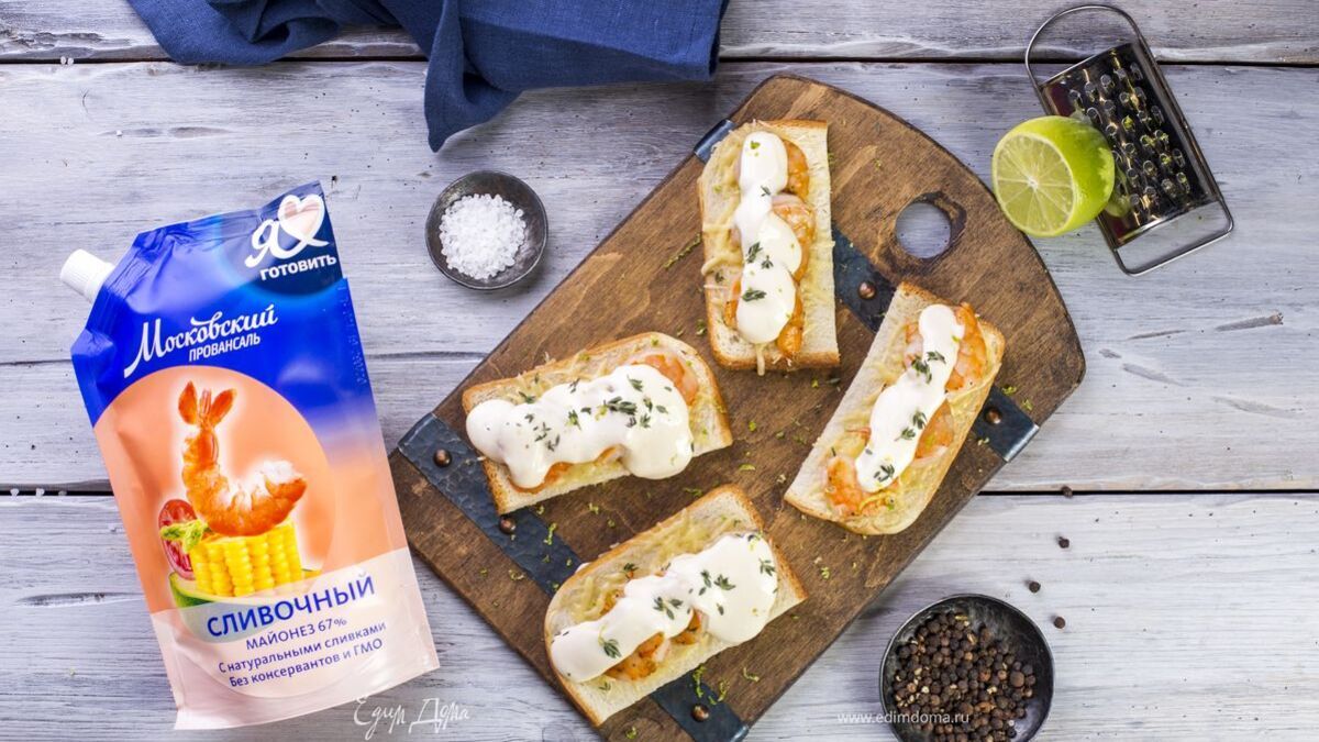 На хлеб выложите креветки. Сверху полейте сливочно-лаймовым соусом.