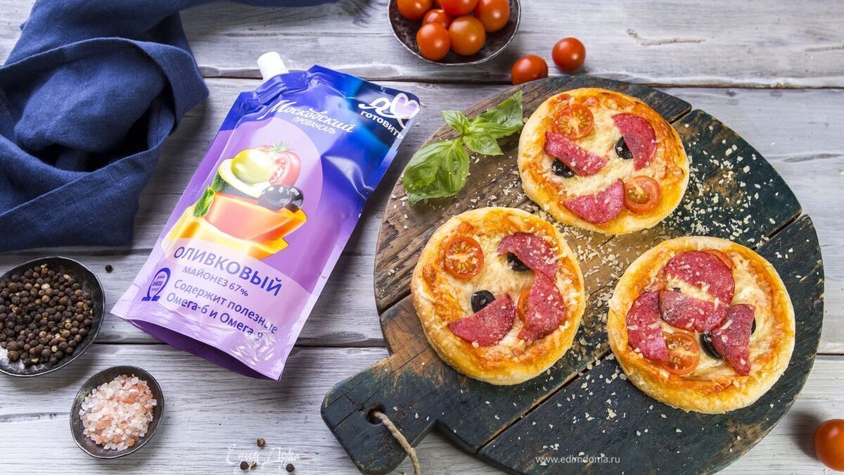 Дрожжевое тесто разморозьте и раскатайте на мини-пиццы. Выложите заготовки на противень, застеленный пергаментной бумагой, и смажьте майонезно-томатным соусом.
