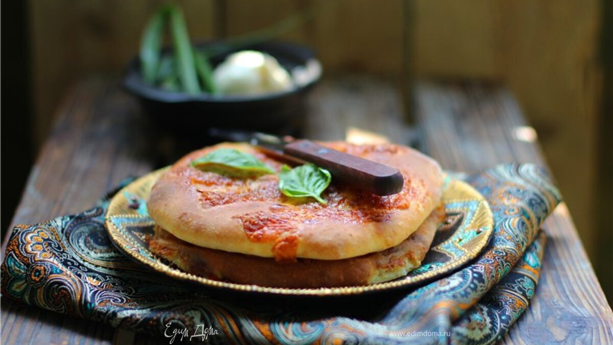Каждую из пяти порций теста слегка посыпать мукой и скалкой раскатать в круг толщиной 5 мм. По периметру сделать проколы зубочисткой, деревянной шпажкой или кончиком ножа, чтобы выпустить воздух. Выложить в центр каждого круга 150 г сырной начинки — смеси имеретинского сыра, сулугуни (70 г пока оставить) и обычного яйца. Соединить края теста и защипнуть. Чуть посыпать пироги мукой, снова раскатать их скалкой до диаметра формы для выпечки и толщины 8–10 мм. - Шаг 3