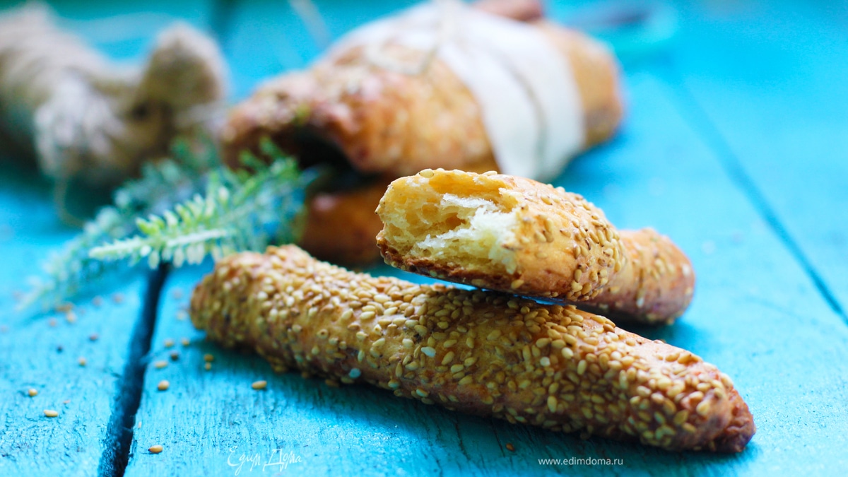 Даем тесту отдохнуть 10–15 минут и нагреваем духовку до 200°C (400°F). Далее формируем хлебные палочки. Отщипываем небольшое количество теста и раскатываем руками по кухонной поверхности. Дело это веселое, поэтому позовите на помощь маленьких помощников. Когда палочка сформирована, высыпаем на стол семена кунжута (не много) и, продолжая формировать палочки, вкатываем семена в тесто. - Шаг 9