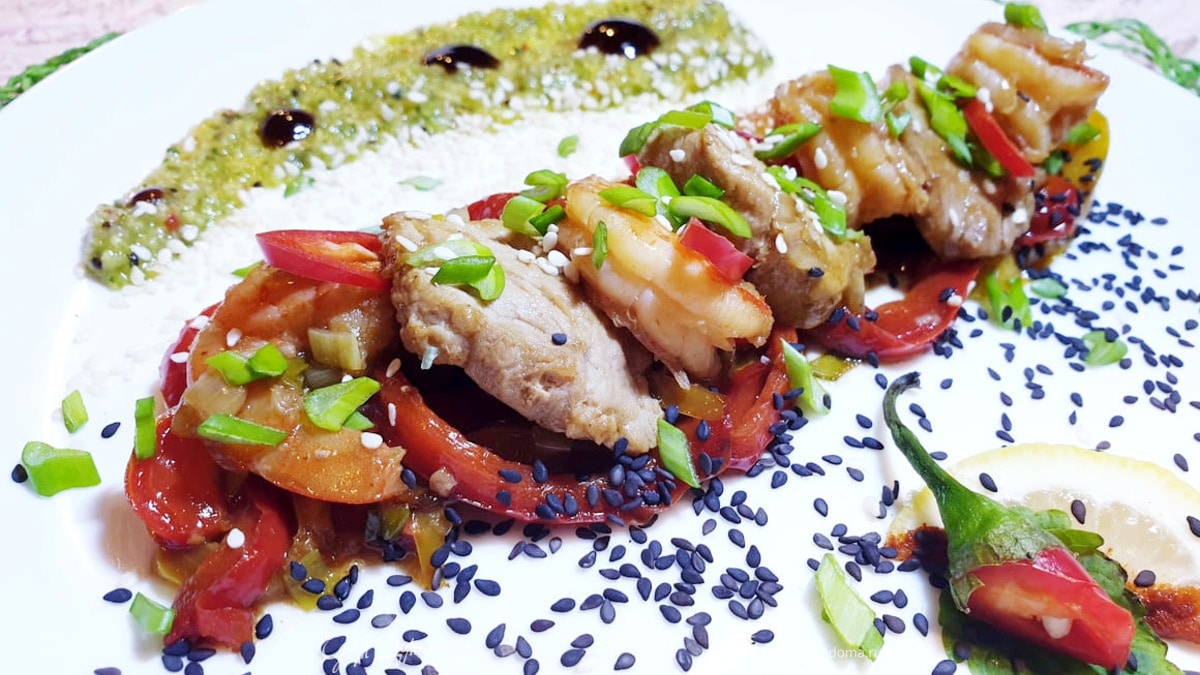 Подаем вкусный стир-фрай из свинины и креветок с сальсой из киви и авокадо.