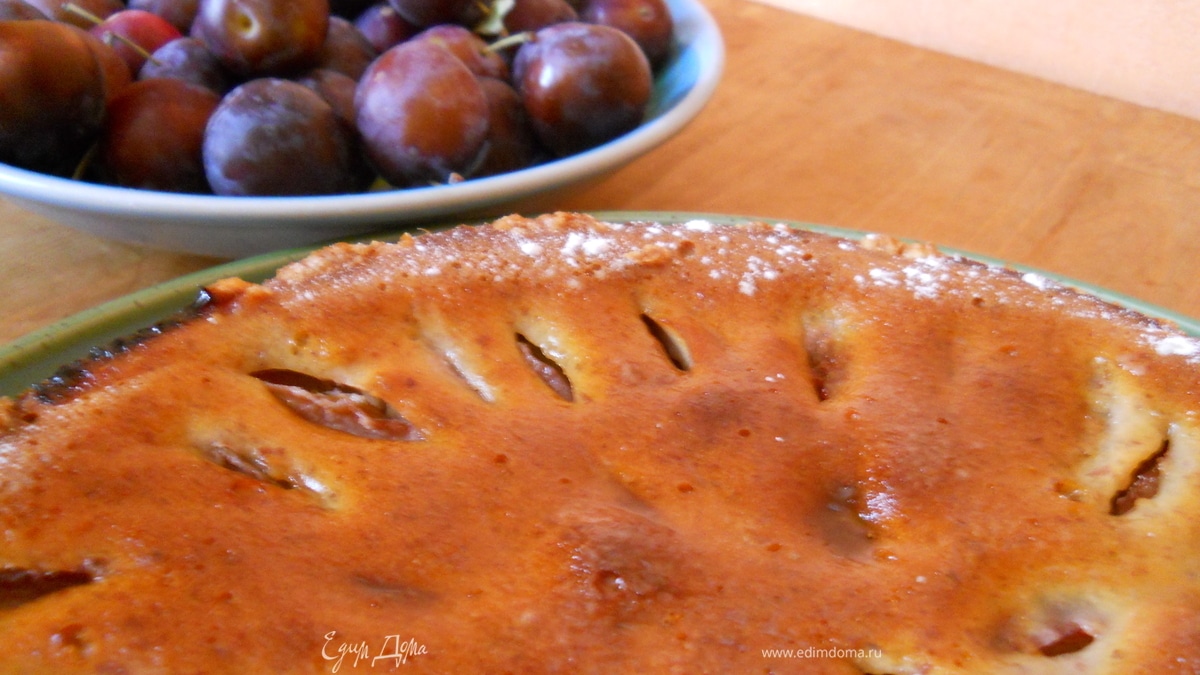 - Шаг 1Предварительно нагреть духовку до 180 градусов. * смешать масло, яйца, сахарный песок в однородный крем... * смешать соль, разрыхлитель и муку. Добавить эту смесь в яичный крем. Всё вымесить в однородное тесто. * разъёмную форму выложить пергаментной бумагой и переложить туда половину теста * выпекать корж 10 минут * сливы вымыть, удалить косточки, разрезать на четыре части и смешать с сахарным песком и 1 ч л ванильного сахара * вытащить корж из духовки, плотно выложить на него сливы, залить оставшимся тестом. Пирог выпекать ещё 40 минут. * пирог оставить в форме ещё на 4 минуты, и потом только вытащить. * перед подачей на столь пирог посыпать смесью из сахарной пудры и ванильного сахара.