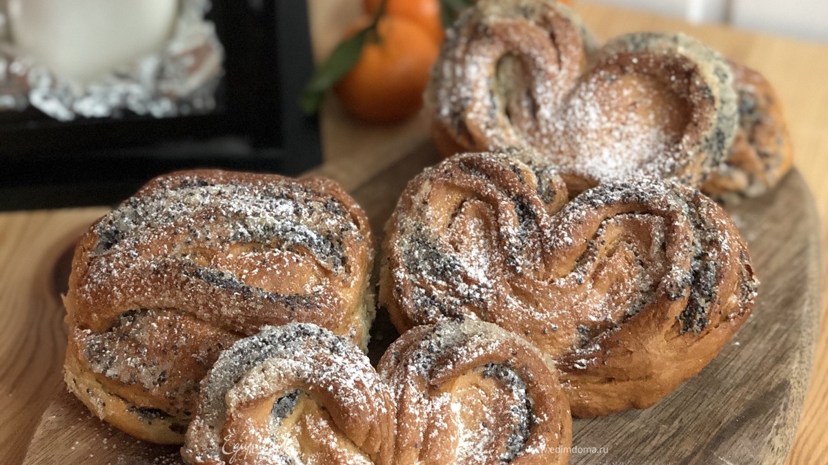 Каждый шарик раскатать в небольшой пласт руками или скалкой, смазать маслом, посыпать сахаром и маком, свернуть в рулет. - Шаг 7