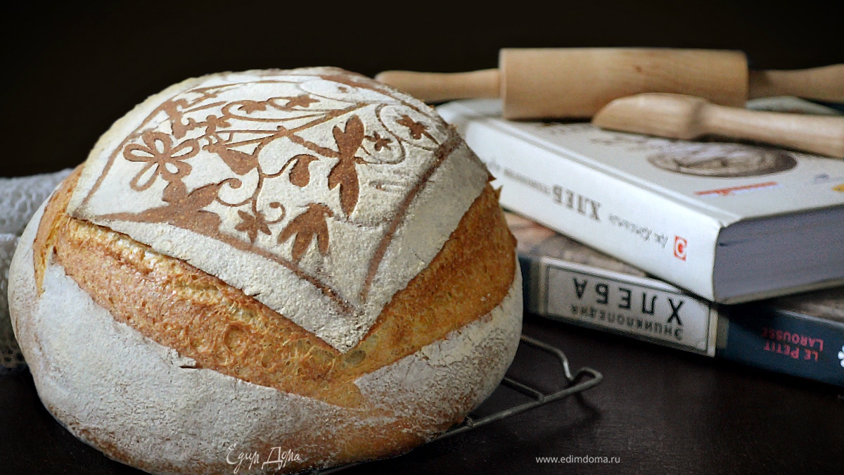 Духовку включить на 230°Cза 45 минут до начала выпечки. Перед выпечкой заготовку перевернуть на лопату швом вниз. По желанию украсить трафаретом и сделать разрезы. Выпекать первые 20 минут под колпаком. Затем колпак снять и продолжить печь еще 15 минут. Готовый хлеб охладить на решетке.