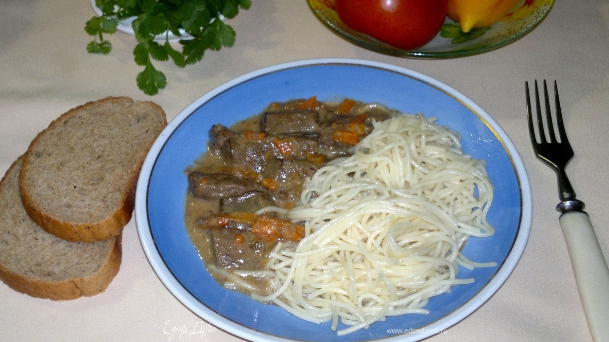 Куриная печень, тушенная в сметане, с овощами