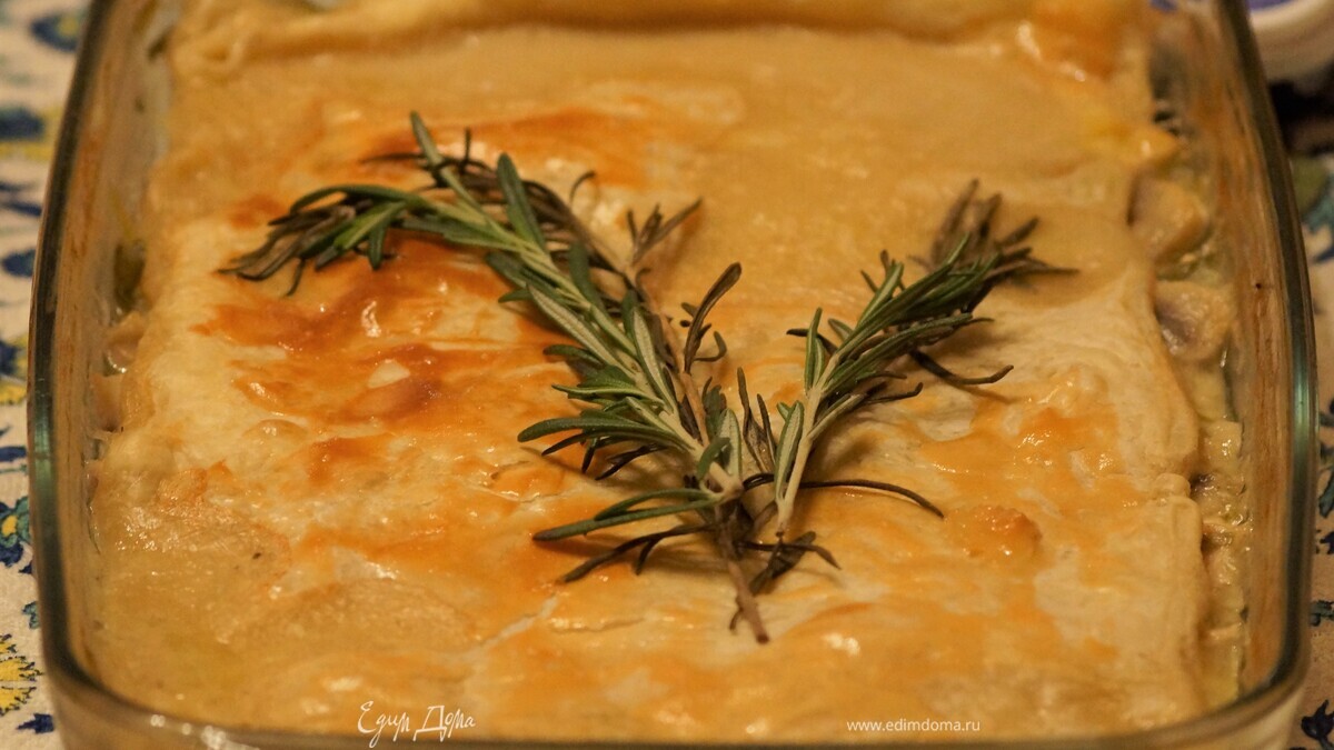 Раскатываем тесто, кладем его сверху, края загибаем, смазываем желтком. Сверху в тесто втыкаем веточки розмарина. Ставим в духовку и запекаем до готовности теста. 20–25 минут при 180°C или 15 минут при 200°C.