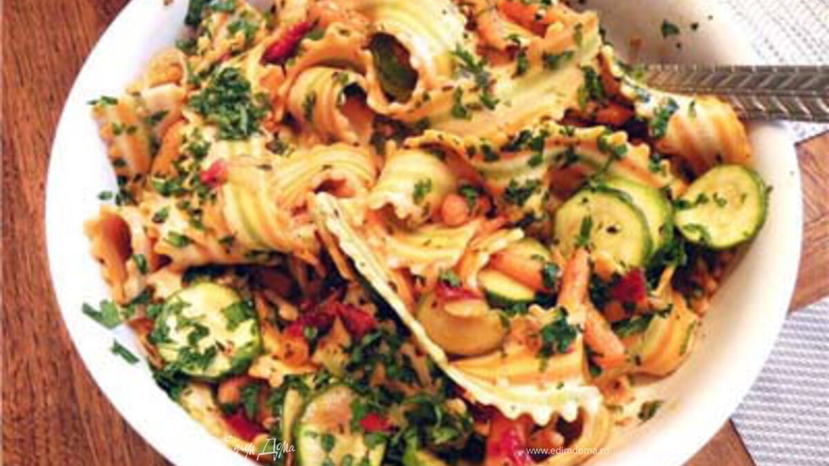 Пассеруем на оливковом масле чеснок. Через пару минут добавляем морковь. Добавляем сушёные или вяленые томаты и лук - шалот, пассеруем ещё пару минут. Добавляем цукини, 1/2 ч.л. базилика, 1/2 ч.л. орегано, соль-перец и ст.л. сливочного масла. Тушим ещё пару минут. Отвариваем пасту. Не промываем. Добавляем в сотейник к овощам и перемешиваем вместе. Посыпаем зеленью.