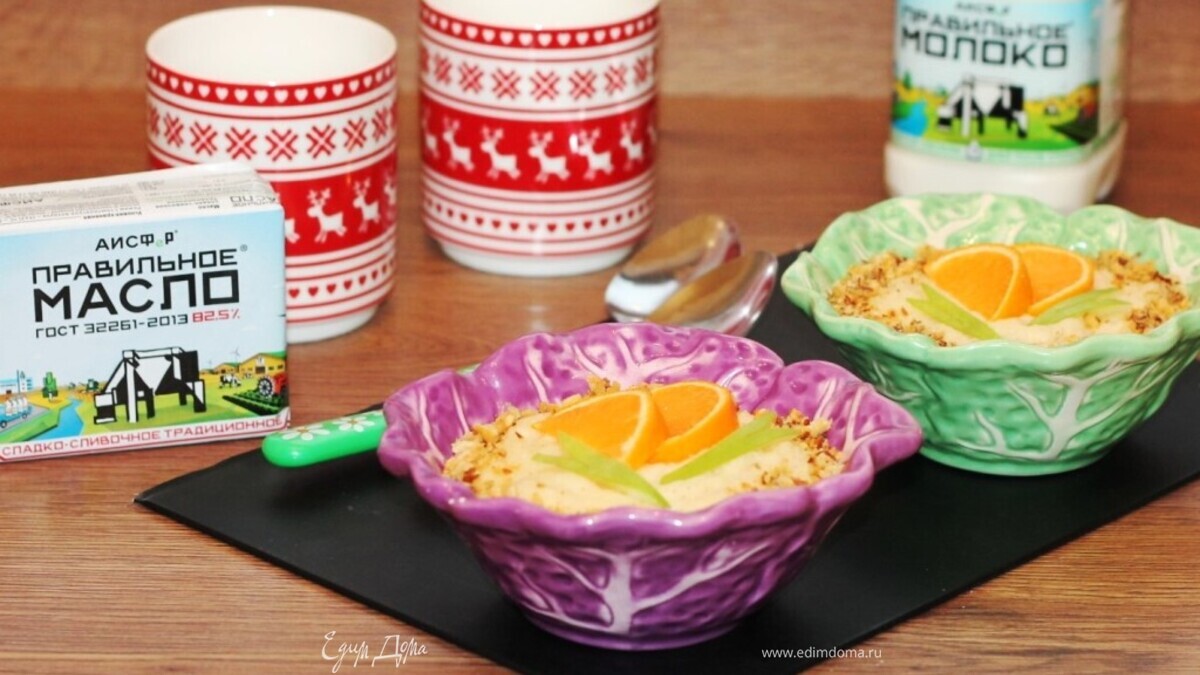 Сладкая манная каша с ароматом корицы, мандарина и жареного ореха.