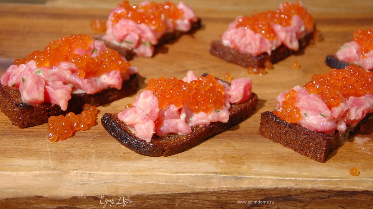 Стейк из тунца нарезать небольшими кубиками, выложить в миску. Добавить сок апельсина, посолить, поперчить, перемешать. Оставить мариноваться на 20 минут.