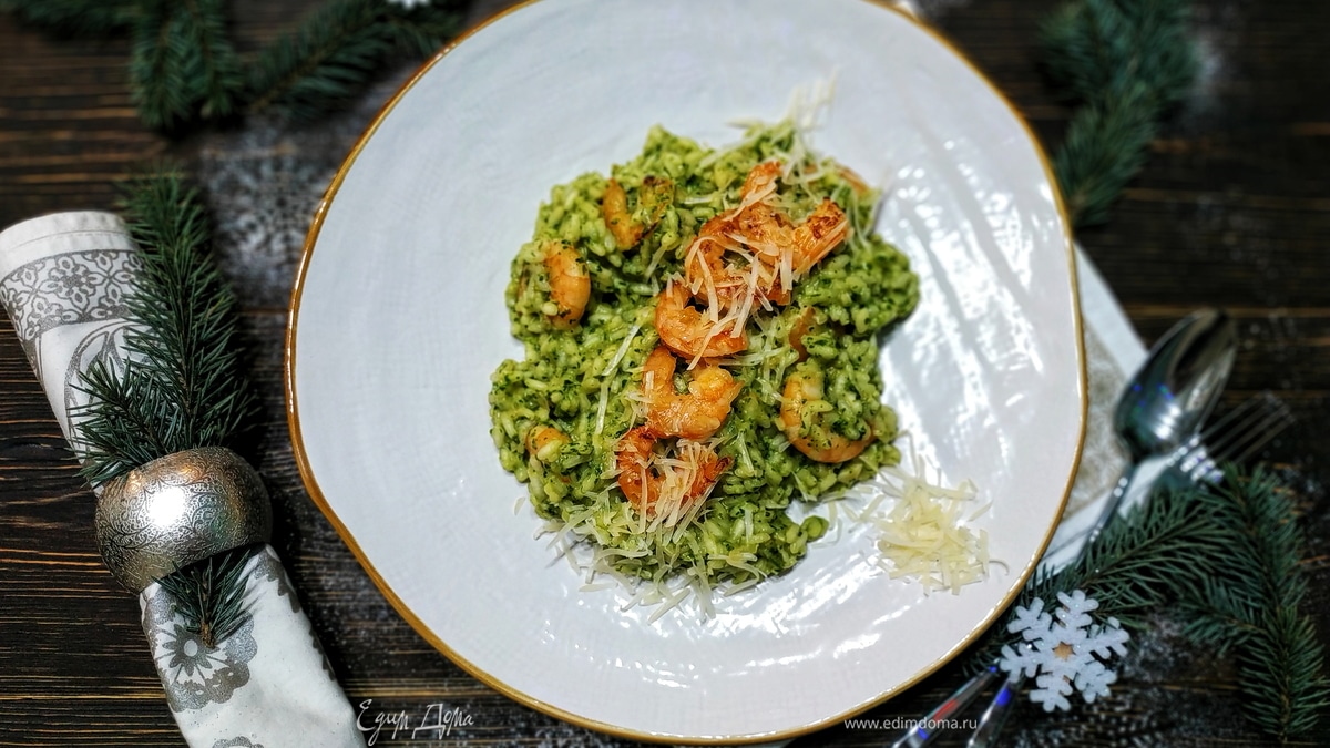 Зеленое ризотто с креветками