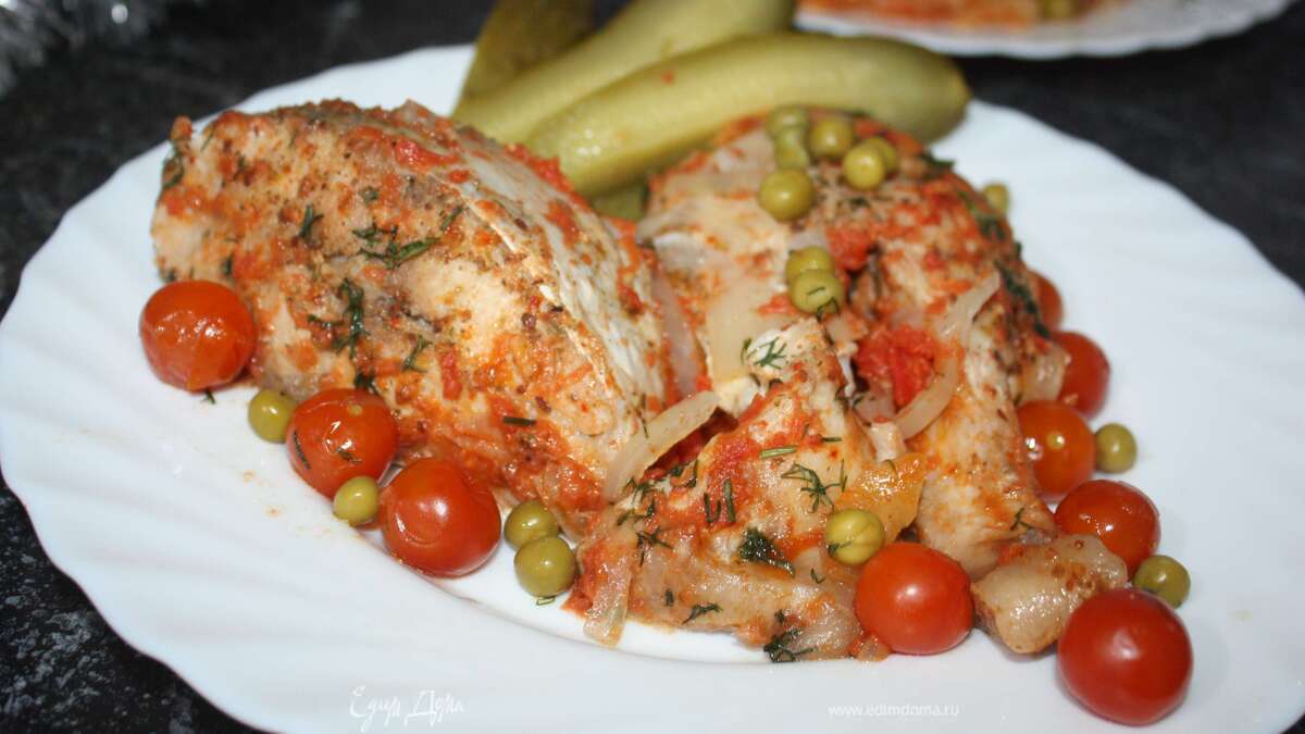 На рыбу выложить оставшийся лук и залить все томатным пюре. - Шаг 6