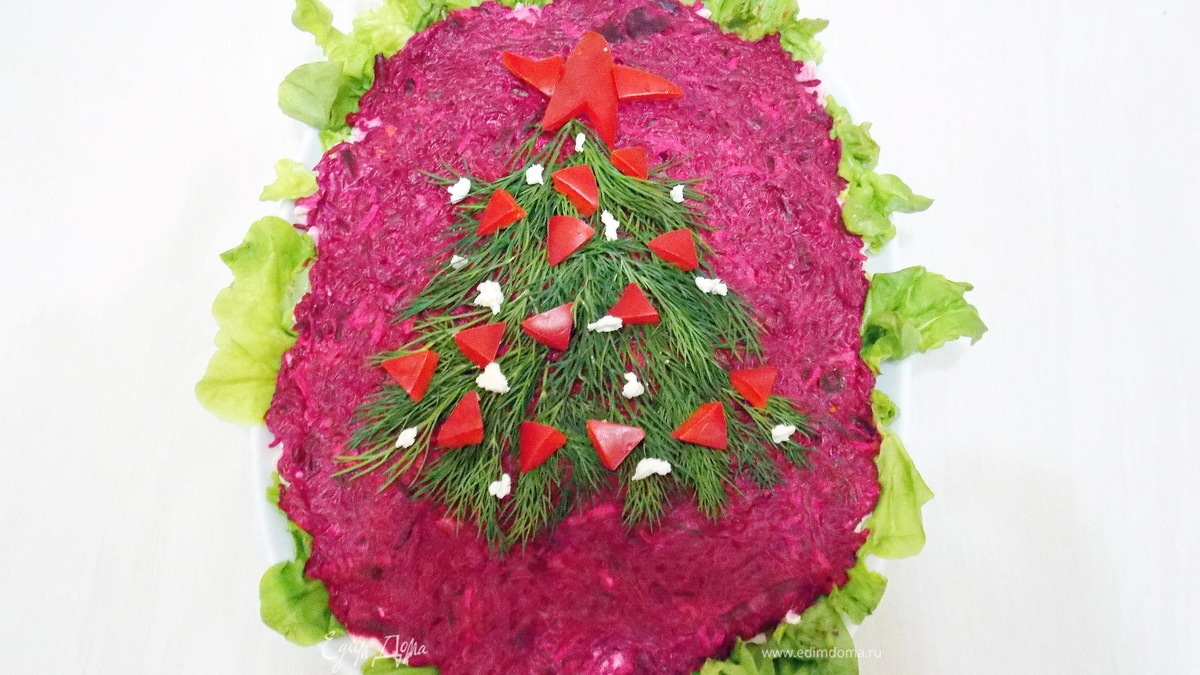 Из укропа сделайте елочку, украсьте флажками и звездой из болгарского перца и кусочками сыра. С Новым годом!