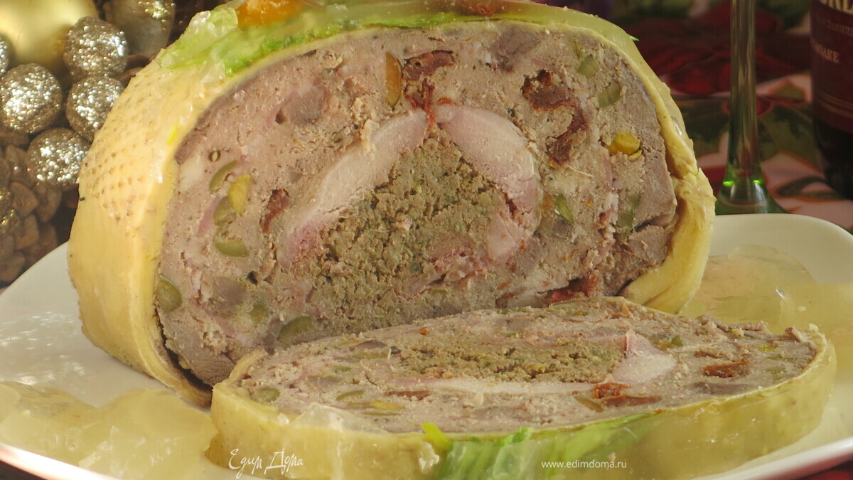 Галантин — изысканная французская закуска. Я уже размещала на сайте рецепт осеннего галантина с чередованием слоев и сердцевиной из печени. Но рецепт настолько емкий и позволяет менять компоновку и состав, что каждый раз получается новое блюдо. Приемы приготовления галантинов и прочих паштетов подсмотрела в книге «Рулеты, паштеты и галантины» — антологии рецептов с подробным и красочным описанием. Главы книги — «Праздничный вид и восхитительный вкус», «Уроки по алхимии вкуса», «Свежесть и цвета природы», «От простых блюд к захватывающему зрелищу» — пробуждают интерес и творчество. Собственно, точно такого рецепта в книге нет, есть паштет из нескольких видов птиц в тесте, слоеные галантины. У американцев и англичан есть рецепты турдакена и гудакена — начиненные индейка или гусь, а начинка — более мелкие птицы: утка, курица или цыпленок. Все эти рецепты подсказали идею этого блюда — птица в птице, перепелка в утке, на разрезе получился рисунок подковки на удачу.