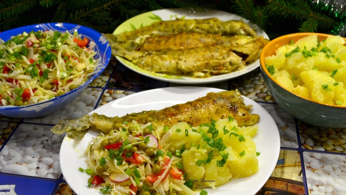 Чистим судака размером на одну порцию, натираем солью и прованскими травами. Полить маслом и оставить мариноваться. В это время почистим картофель и нарежем салат. - Шаг 2