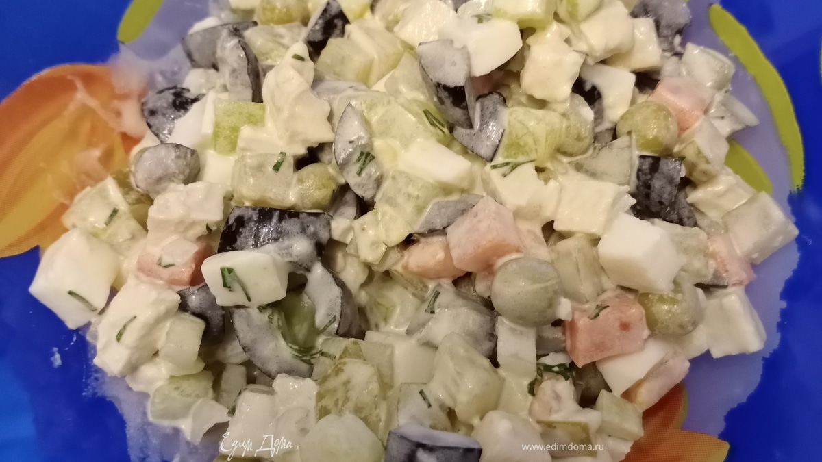 Ну вот наконец-то и у нас дошло дело до оливье) У всех есть свои предпочтения относительно пропорций ингредиентов, все знают, какой овощ сколько варить, поэтому просто поделюсь с вами нашим вариантом. Наша фишка в этом салатике — маслины)