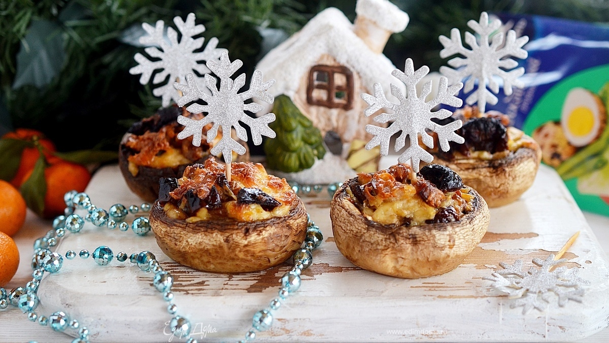 Интересная и всеми любимая закуска в виде фаршированных шляпок шампиньонов. В начинке жареные грибочки, сыр и вяленые томаты. Просто готовится, но красиво смотрится, вкусно и в горячем, и в холодном виде.