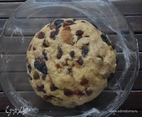 Через час тесто обмять, добавить сухофрукты и снова оставить на час для повторного подъема. Тесто достаточно тяжелое, поэтому не ждите, что оно сильно увеличится в объеме.