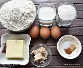К жидким составляющим добавить ванилин, соль, корицу и имбирь. Замесить тесто. Оставить в теплом месте на час для подъема.
