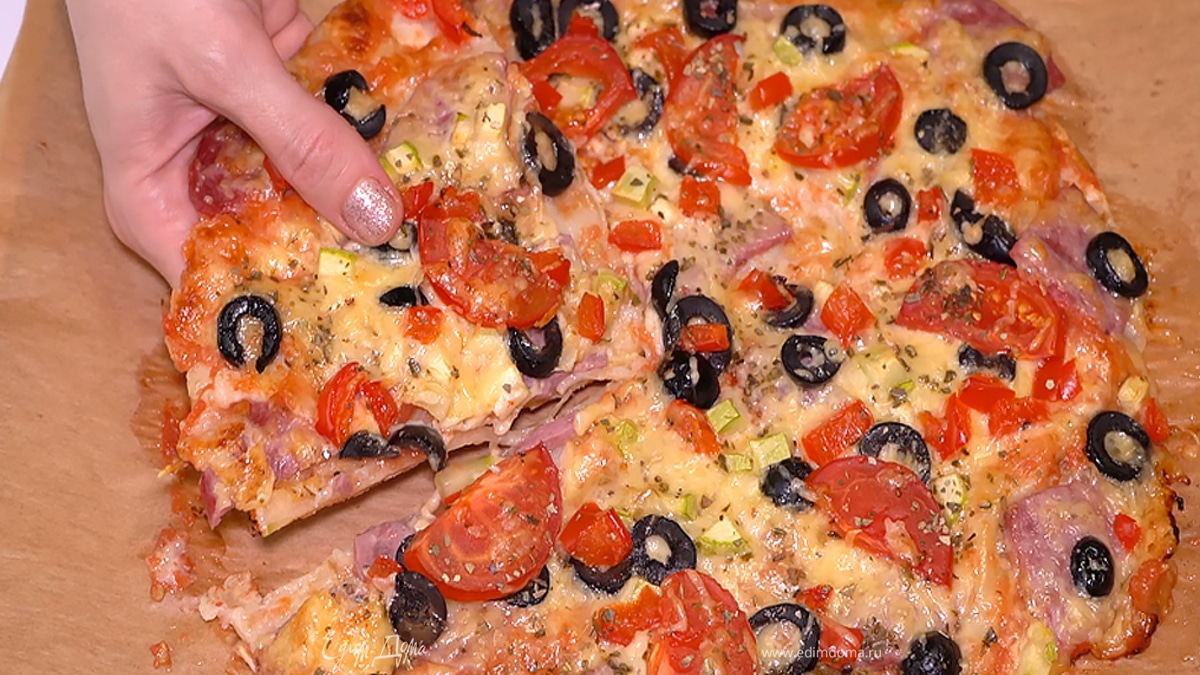 Получается очень вкусная пицца без заморочек с тестом! Всем приятного аппетита! :)