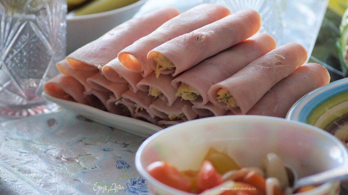 На каждый слайс ветчины кладем сырную массу и заворачиваем рулетом.