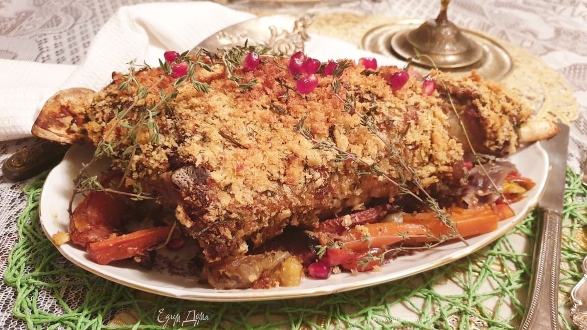Баранья нога, запеченная в хлебной корочке, — простое, но невероятно вкусное блюдо. Благодаря панировке мясо получается нежным и сочным, а пряная хлебная корочка