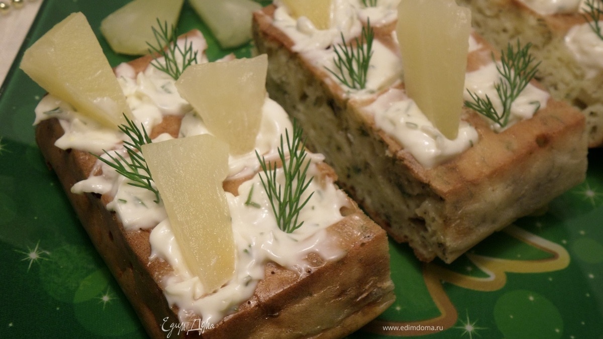 Подаем закусочные вафли, украсив их зеленью.