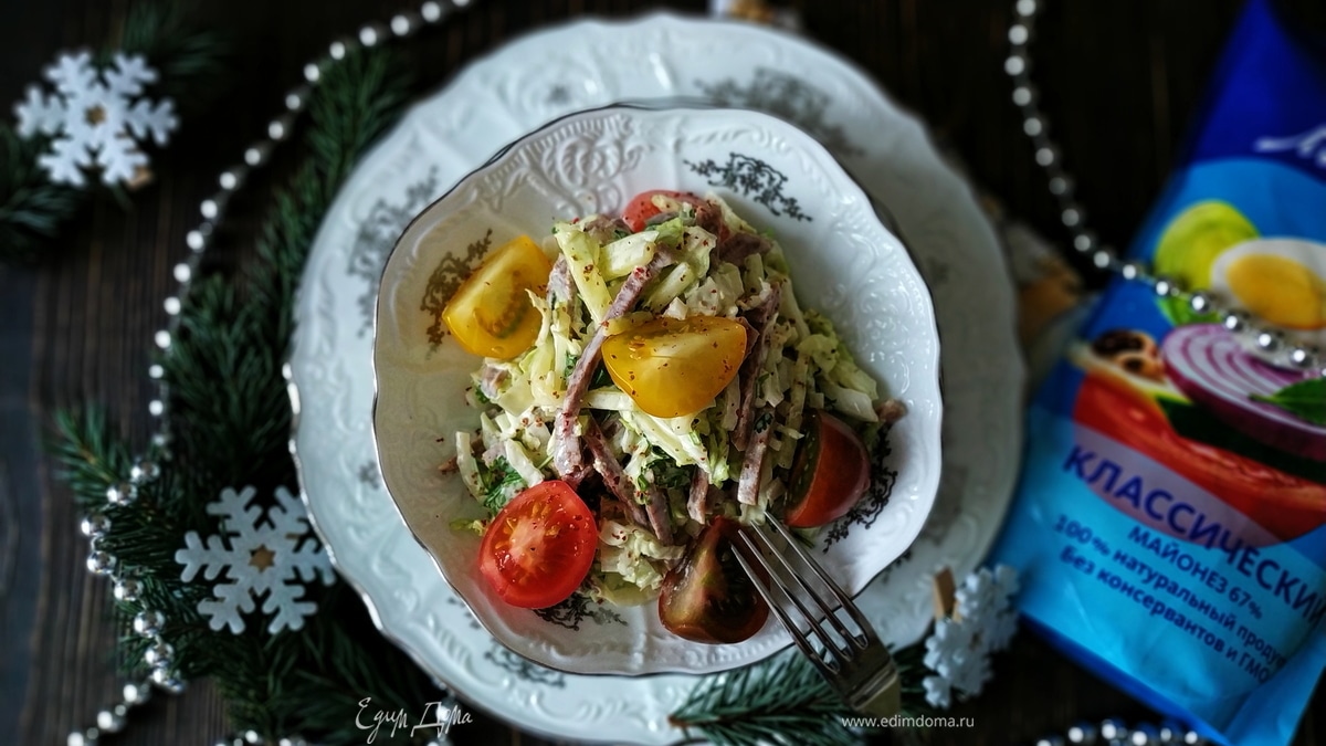 Говяжий язык предварительно отварить, очистить от белой пленки. Завернуть в фольгу и убрать в холодильник для остывания. Холодный говяжий язык нарезать соломкой. - Шаг 4