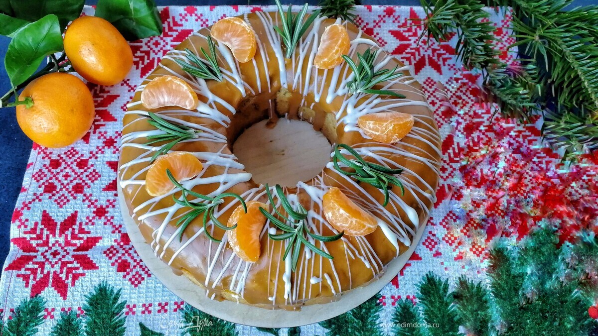 Теперь щедро поливаем кекс нашей чудесной карамелью, остывшей до комнатной температуры. Затем украшаем растопленным белым шоколадом, дольками мандарина и веточками розмарина!