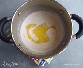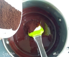 Всыпать молотый кофе, перемешать и отставить кастрюлю в сторону на минуту.