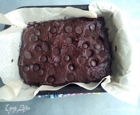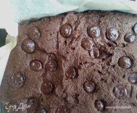 Духовку разогреть до 180°C. Форму выстелить пергаментом, распределить тесто по форме, сверху добавить шоколадные капли. Поставить в духовку на 20–25 минут.