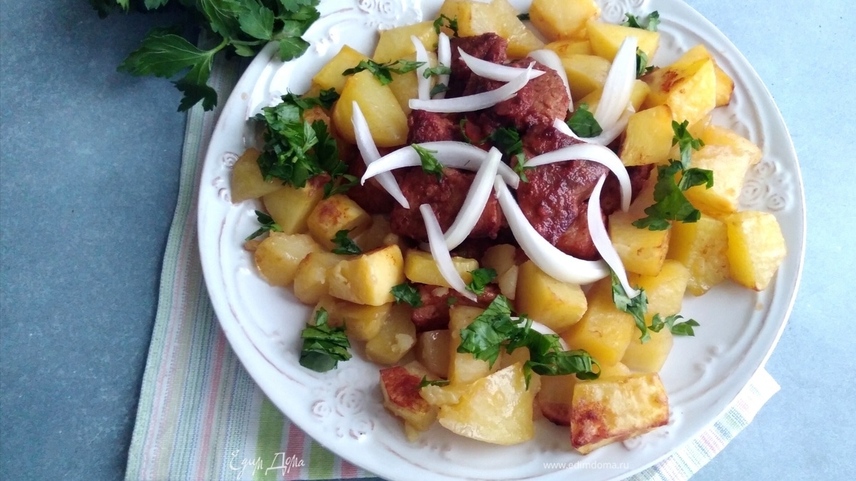 Перед подачей перемешать мясо и картофель вместе, посыпать петрушкой и сванской солью. Подавать с маринованным луком.