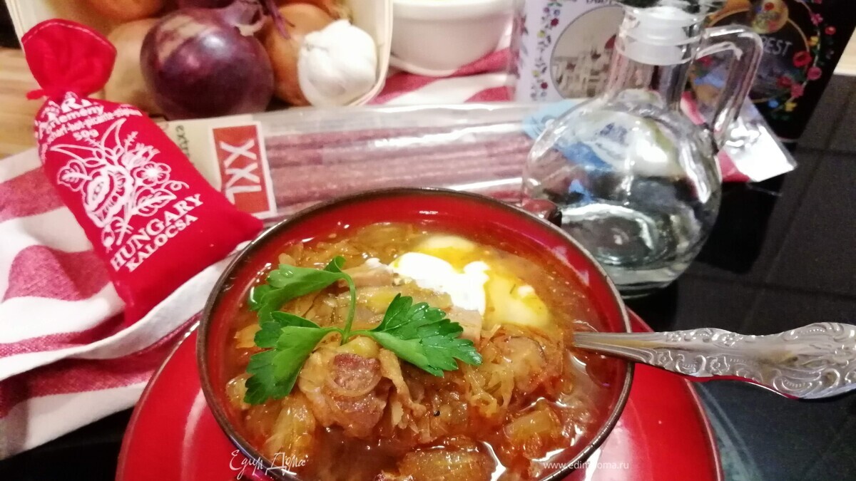 В основу венгерских щей закладывается большое количество квашеной капусты, а в сам бульон — копченая свинина, колбаски и бекон. Бекон нужно предварительно обжарить с паприкой и