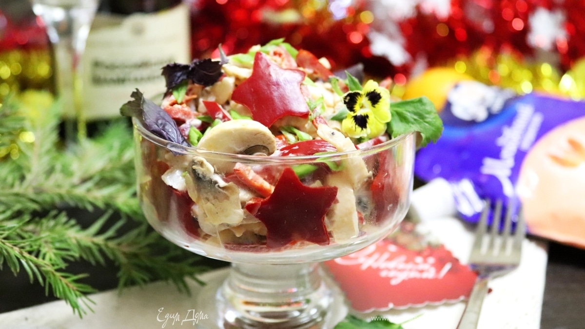 Но, признаюсь вам, что грибы для этого салата по рецепту обжариваются. Я люблю использовать для салатов сырые шампиньоны, слегка подмаринованные соком лимона. Их и положила в салат. Ну а вы решайте сами.
