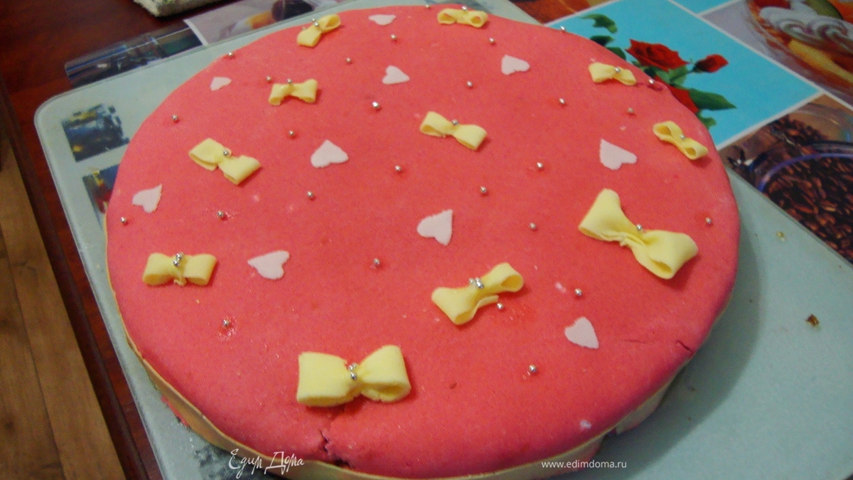 - Шаг 7Нижний корж смазать кремом 1,средний-кремом 2,а верхний корж и бока торта-абрикосовым джемом(это для того,чтобы наша мастика не поплыла).Сверху выкладываем раскатанную мастику одного цвета и украшаем бантиками из другого.Не обязательно делать именно бантики.Поэкспериментируйте!Можно сделать фигурки,цветы и многое другое.Дайте волю своей фантазии!!!