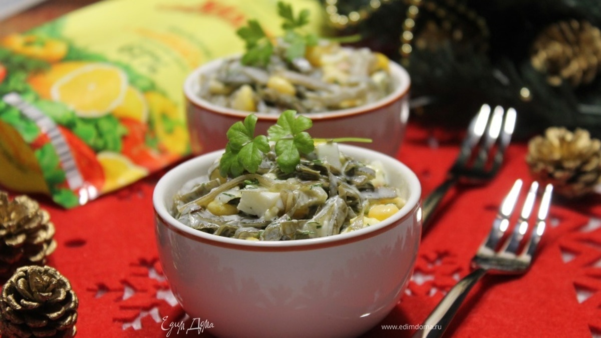 Подготовим продукты. Яйца отвариваем в подсоленной воде, остужаем и очищаем. Консервированную кукурузу и морскую капусту откидываем на дуршлаг. - Шаг 2