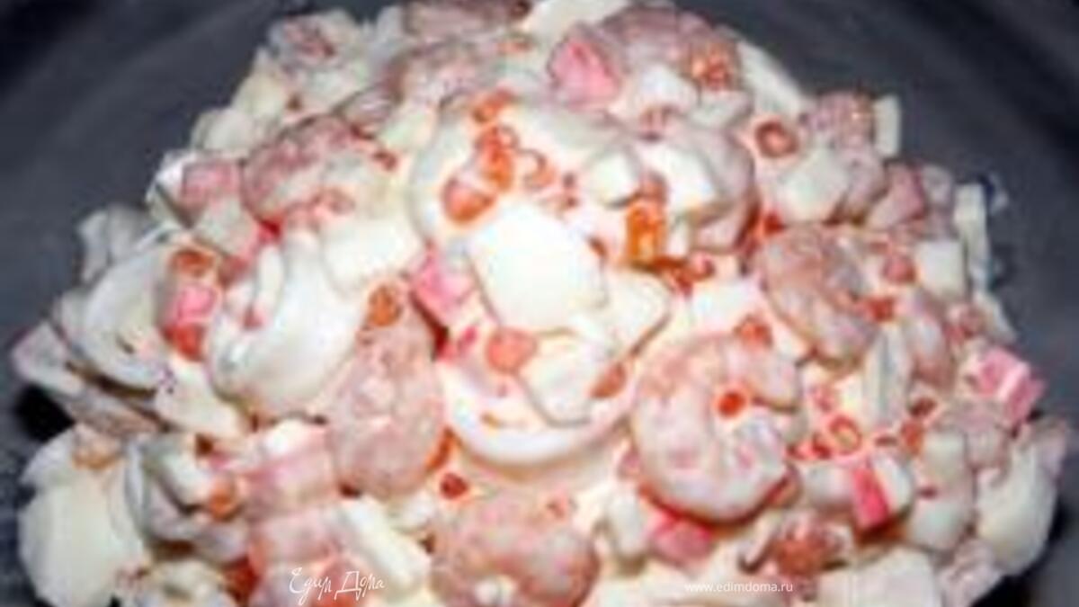 - ПодготовкаОтвариваем яйца. Варим, креветки в слегка подсоленной воде 3-4 мин. Затем в кипящую воду бросаем, предварительно нарезав на кольца кальмары, варим 3-4 мин. Нарезаем крабовые палочки и зеленый лук. Все сложить в салатницу добавляем майонез, перемешиваем, и только потом добавляем красную икру (чтобы не полопалась). Соль-перец-по вкусу, но советую солить после смешивания всего, т.к. икра и майонез могут дать достаточно соли.