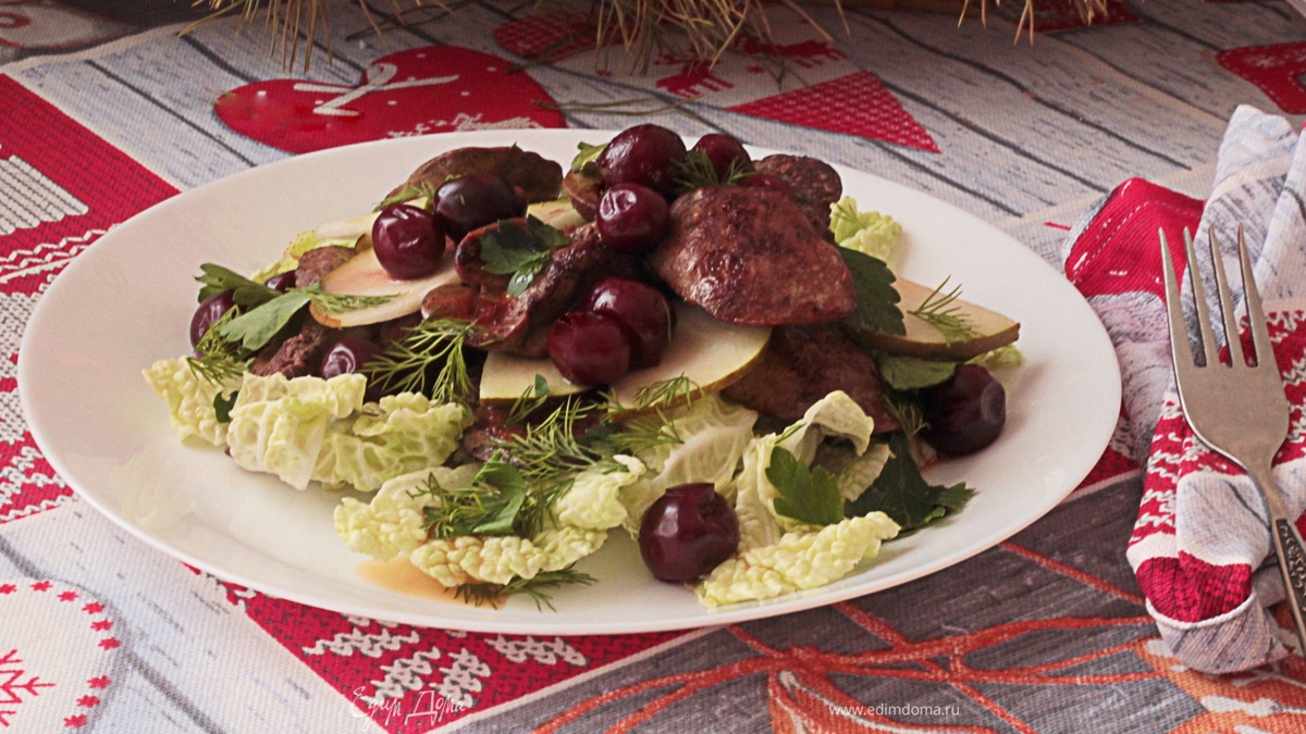 Теплый салат с куриной печенью, грушей и маринованной вишней
