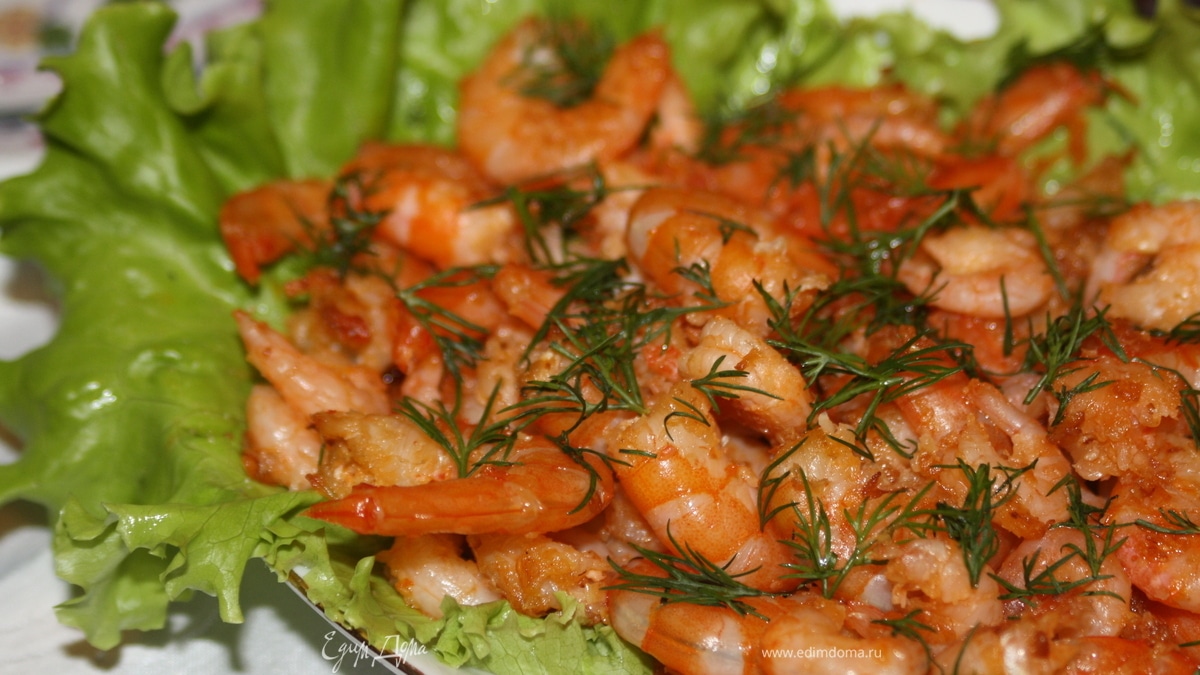 - Шаг 1Отвариваем креветки, очищаем от панциря, жарим в сл. масле - 5-7 минут с добавлением чеснока( мелко нарезанный, можно выдавить) Подаем теплыми на красивом блюде!!! Приятного вам аппетита!