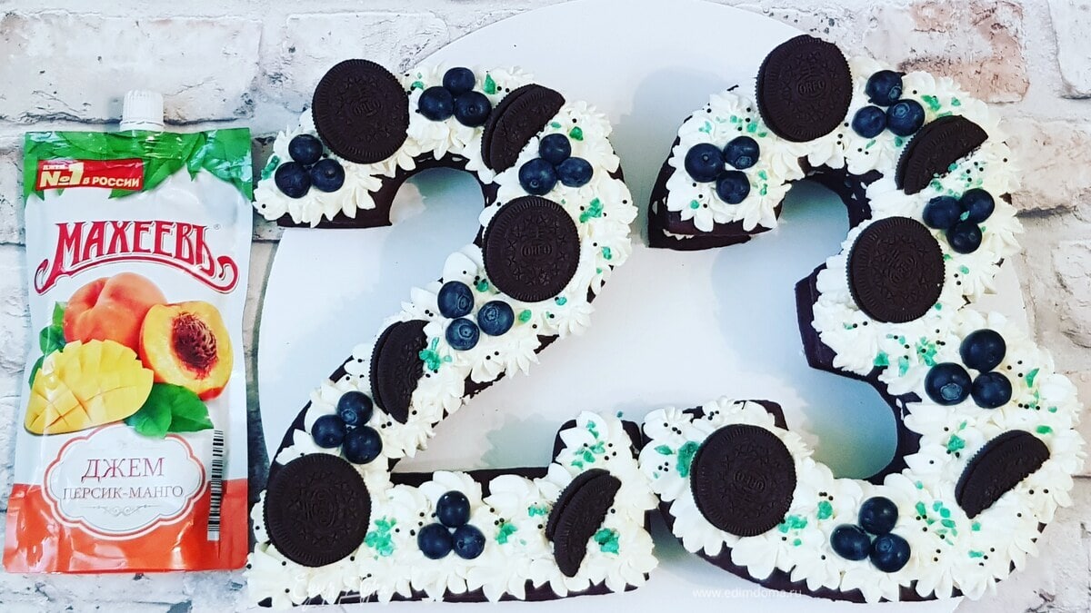 Медовые шоколадные коржи с нежнейшим кремом из маскарпоне и сливок, прослойкой джема ТМ «МахеевЪ» из персиков и манго порадуют ваших защитников на 23 февраля и не только.