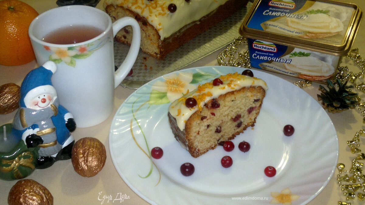 Нежный кекс с ароматом апельсина и кислинкой клюквы под воздушным кремом из плавленого сливочного сыра Hochland. Помимо крема, сыр также присутствует в тесте. Кекс прекрасно подойдет для праздничного новогоднего или рождественского стола.