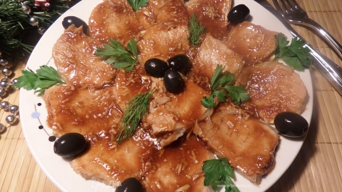 По прошествии определенного времени вынимаем мясо из холодильника, украшаем зеленью и маслинами. Подаем на стол. - Шаг 6