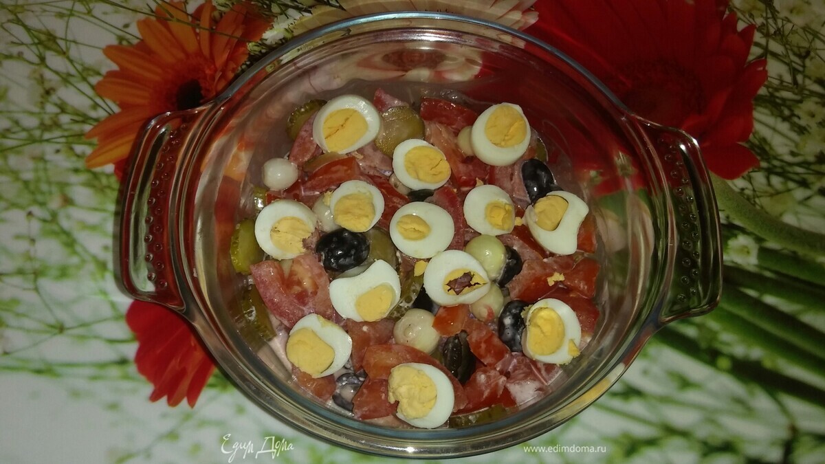 Затем добавляем к овощам соус и перемешиваем все еще раз. Выкладываем сверху нарезанные кружочками перепелиные яйца. Салат готов. Приятного аппетита!