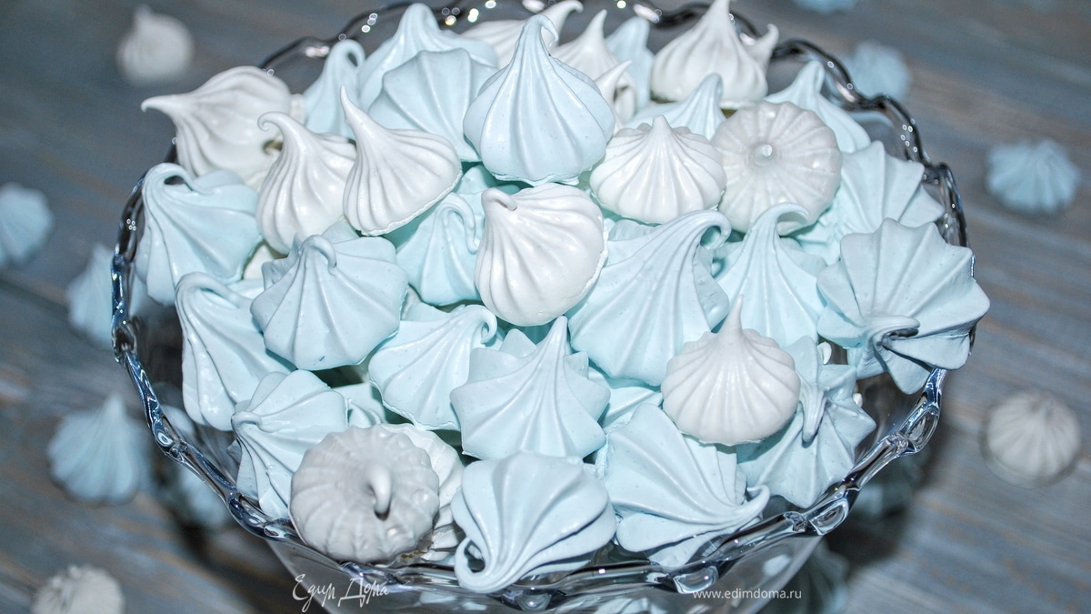 Переложите готовую белковую массу в кондитерский мешок с насадкой (я одну порцию подкрасила синим пищевым красителем, чтобы получился нежный голубой цвет). На противень выстелите пергамент и отсадите безе. Выпекайте в духовке при 90–100°C, режим «верх-низ». - Шаг 7