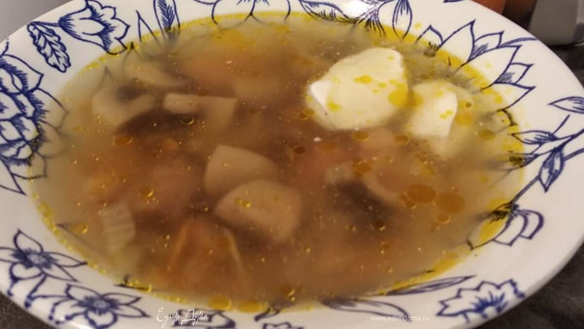 Нашла этот рецепт в старом журнале «Соляночка» (за 2007 год), показалось интересным попробовать сочетание грибов и ветчины. В оригинальном рецепте предлагалось использовать еще и бульонные кубики но я, будучи их принципиальным противником, обошлась без них. Также я не люблю добавлять свежую зелень в грибные супы. Если вы любите, добавьте петрушку, как в оригинале. Вкус получился интересный. И сам суп легкий. В принципе, экспериментом довольна. Попробуйте и вы.