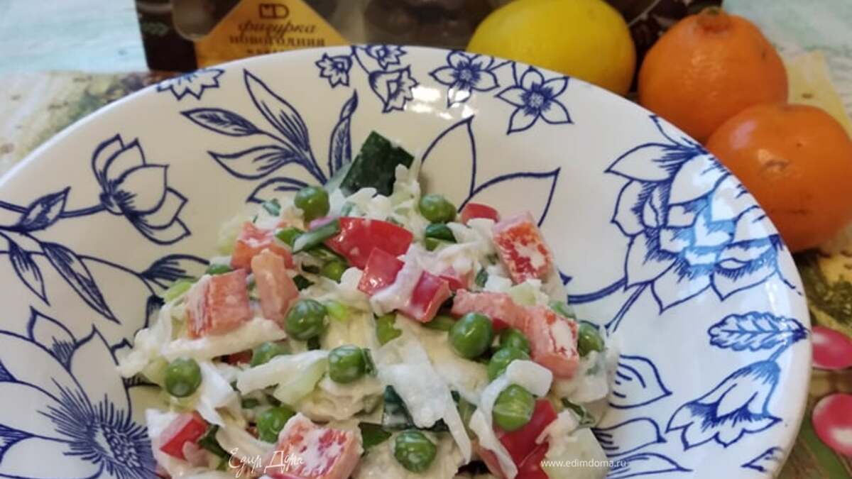 Очень люблю дайкон. Салаты с ним получаются сочными и легкими. Попробуйте! Горошек можно использовать консервированный или замороженный. Я взяла замороженный. По рецепту салат заправляется майонезом, я обычно делаю 50/50 со сметаной.