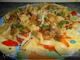 Добавить куриное филе. У меня бедро. Я думаю, что получается сочнее, чем с грудкой. Но ее тоже можно. Обжарить до полуготовности курицы минут 15. Посолить и поперчить. Добавить сухие травки. - Шаг 4Макароны отварить в подсоленной воде до полуготовности и откинуть на дуршлаг.